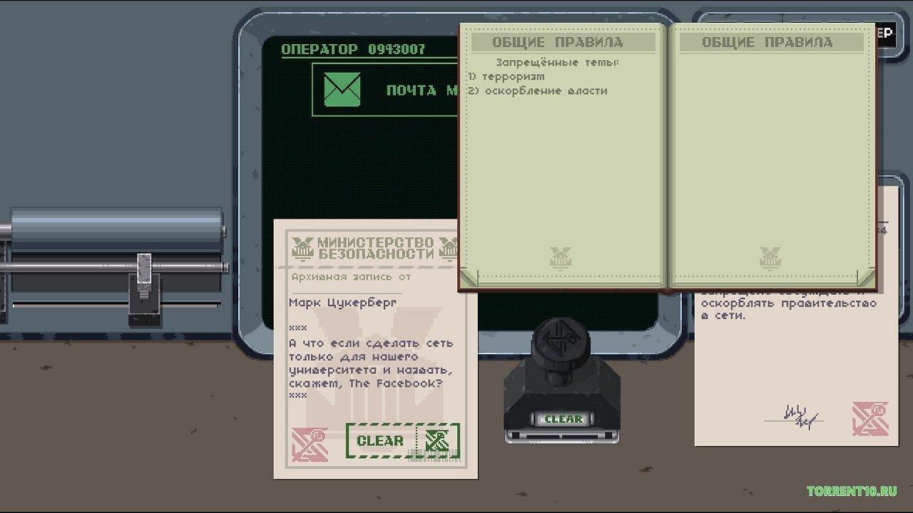 В представленном игровом проекте Bystander у вас есть возможность почувствовать себя настоящим агентом по отслеживанию сети во времена тоталитаризма. Ваша основная задача заключается в нахождении среди чужих переписок в сети те, которые противоречат текущим законам, а все их копии вы будете получать по факсу. Также вы должны следить за всеми новыми законами, искать скрытый смысл в каждой фразе, и самое главное, докладывать обо всех нарушениях, а перед этим вам необходимо Bystander скачать торрент на нашем замечательном сайте. В вашем личном распоряжении будут самые разные программы для проверки подлинности документов, для отслеживания преступников в сети и поимки революционеров.